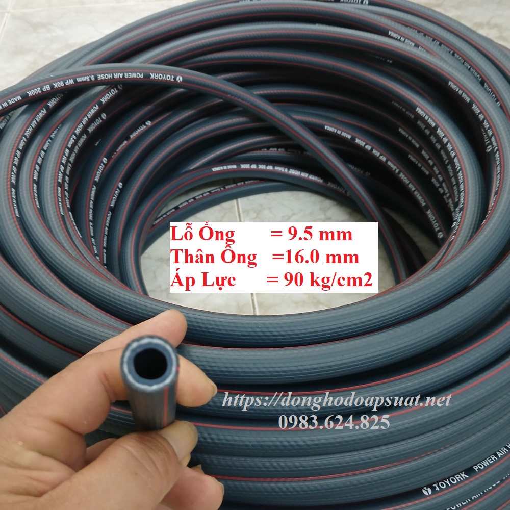 Dây hơi Toyork Hàn Quốc Phi 9.5 (9.5x16mm) , Ống hơi cao su Hàn Quốc Toyork lỗ ống 9.5. Power air hose 9.5 Toyork Korea. Là loại ống hơi cao su chất lượng cao, siêu bền, có thương hiệu. Được sử dụng nhiều trên thị trường từ lâu. Dây được sản xuất tại Hàn Quốc, sử dụng cao su nguyên sinh để sản xuất. Độ đàn hồi cao, giúp dây chịu được áp lực cao, độ bền tạo thành thương hiệu.