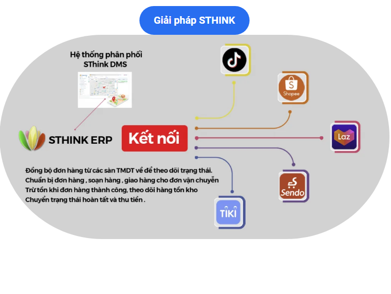 Dễ dàng quản lý kho, nhà cung cấp, đơn vị vận chuyển, tài chính và bán hàng trên kênh như Website, Facebook, Tiktok & sàn TMĐT Shopee, Lazada, Tiki, Sendo.Giải pháp STHINK