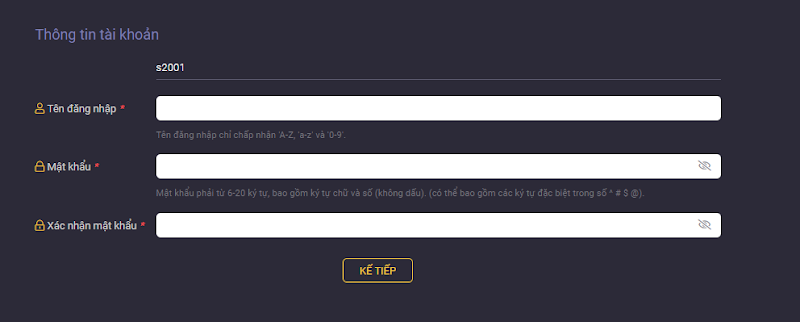 Tiếp theo, bạn cần nhập các thông tin đăng ký sau:- Tên đăng nhập: Tên đăng nhập là tên bạn sẽ sử dụng để đăng nhập vào tài khoản Vegas79.
